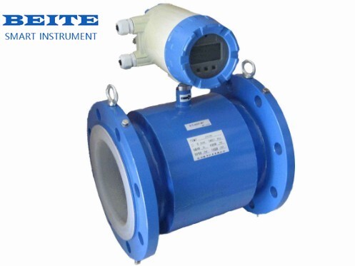 The measuring principle of electromagnetic flowmeter is based on the electromagnetic induction law of Farady. The sensor is mainly composed of measuring tube with isolate lining, a pair of electrodes installed by penetration of the measuring tube wall, a pair of coils and iron core to produce working magnetic field. When the conductive fluid flows through the measuring tube of the sensor, the voltage signal in direct proportion to the average flow velocity of the fluid will be inducted on the electrodes. The signal is amplified and treated by the transmitter to realize various display functions.